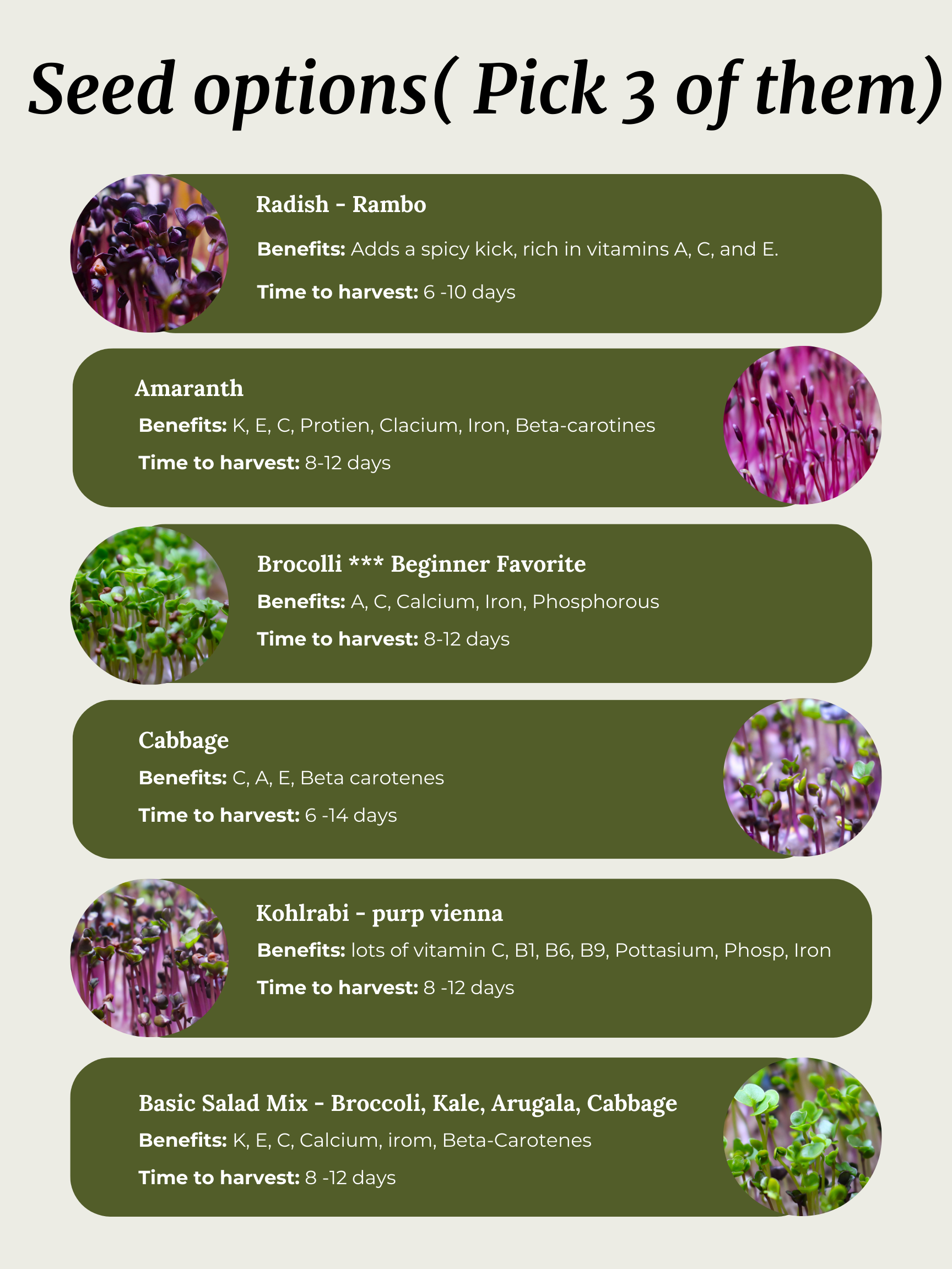 - Seed Selection: Up to 3 types of premium microgreen seeds tailored to your taste.